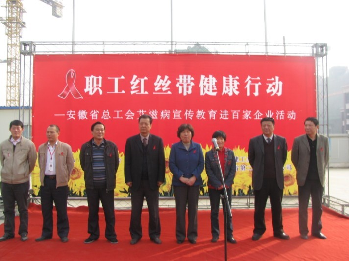2010年11月24日上午,第23個“世界艾滋病日”即將來臨之際,由安徽省總工會、省建工集團(tuán)開展的“職工紅絲帶健康防艾宣傳進(jìn)百家企業(yè)活動”在省二建天下錦城二期項目部舉行啟動儀式,省總工會廳級巡視員、省女職工委主任牛和桂,省建工集團(tuán)工會副主席李鵬飛,工會女職工委主任胡愛紅,省二建黨委書記朱治淮、工會主席李林等出席了啟動儀式。該項目部百余農(nóng)民工表示,今后要積極主動地加入到預(yù)防和控制艾滋病的行動中來,為遏制艾滋病在我省流行蔓延盡到應(yīng)有的貢獻(xiàn)。