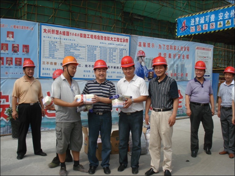 7月17日上午,集團(tuán)公司黨委書記、董事長胡運(yùn)成,工會(huì)主席、紀(jì)委書記牛曙東等一行在安徽二建公司總經(jīng)理戴樹明、黨委書記朱治淮、工會(huì)主席李林等陪同下,冒著酷暑,來到了二建公司承建的大興新居A組團(tuán)1#、4#項(xiàng)目安置房工地,親切地慰問了生產(chǎn)一線職工,并送去了防暑降溫物品。