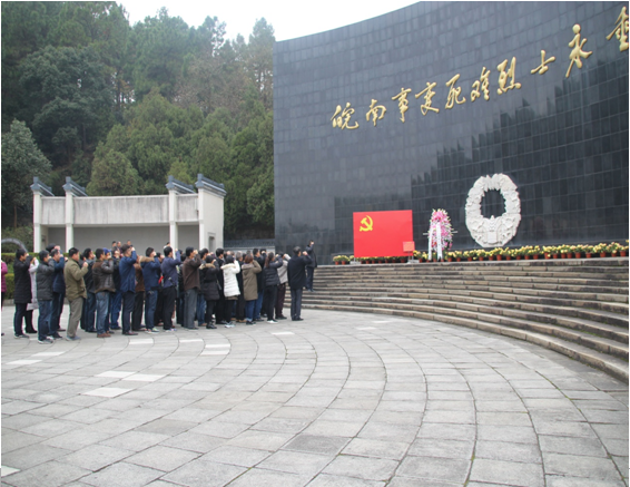 初冬的皖南山區(qū)并無太多蕭瑟之感,目之所及,綿延起伏的群山上仍是郁郁蔥蔥,新四軍軍部舊址就位于這綠水青山之間。黨員同志們懷著敬仰的心情先后參觀了新四軍軍部舊址、新四軍軍部大會堂舊址、皖南事變烈士陵園,并敬獻(xiàn)花籃與挽聯(lián)。通過講解員的解說,大家了解了新四軍的建立發(fā)展壯大過程、軍部主要機(jī)關(guān)設(shè)置、新四軍將領(lǐng)及女兵的英勇抗日的事跡,以及震驚中外的“皖南事變”的經(jīng)過。豐富而詳實(shí)的館藏史料,讓黨員們重溫了中國共產(chǎn)黨領(lǐng)導(dǎo)中國人民取得革命成功的艱辛歷程;同時也深刻認(rèn)識到只有在中國共產(chǎn)黨領(lǐng)導(dǎo)下,中國的革命事業(yè)才會取得不斷勝利。
