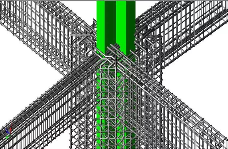 在復(fù)雜節(jié)點(diǎn)的地方,鋼筋的碰撞發(fā)揮著重要的作用。在型鋼混凝土梁柱節(jié)點(diǎn)處,鋼筋數(shù)量眾多,且因?yàn)樾弯摰拇嬖?,造成梁的縱向鋼筋無法直接拉通。BIM工程師搭建節(jié)點(diǎn)模型,對(duì)鋼筋的排布進(jìn)行調(diào)整,通過繞彎、預(yù)留洞口、焊接等方式,避免鋼筋與型鋼的碰撞。