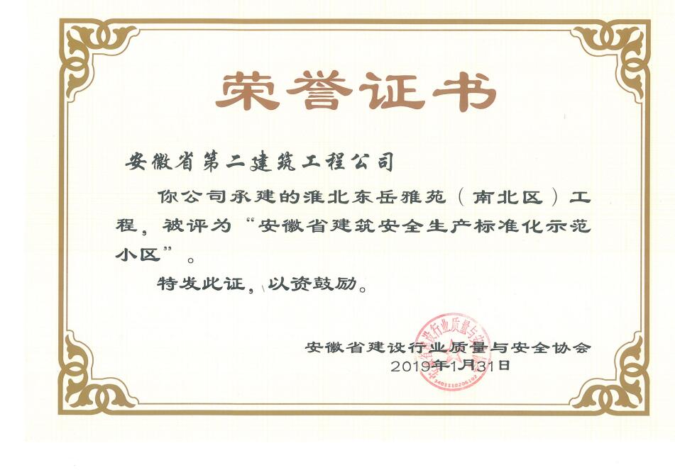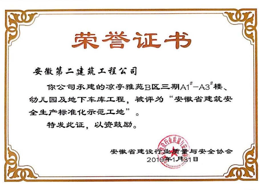 近日,從安徽省建設(shè)行業(yè)質(zhì)量與安全協(xié)會獲悉,安徽二建承建的肥西涼亭雅苑、阜陽楓林源筑、阜陽廣元大學(xué)城、宿州恒馨印象、淮北東岳雅苑5個項目獲得2018年度“安徽省建筑施工安全生產(chǎn)標(biāo)準(zhǔn)化示范工地”稱號,為公司再添榮譽(yù)。