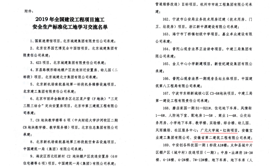當(dāng)日下午,分公司收到《關(guān)于發(fā)布2019年全國(guó)建設(shè)工程項(xiàng)目施工安全生產(chǎn)標(biāo)準(zhǔn)化工地學(xué)習(xí)交流名單的通知》,阜陽(yáng)廣元大學(xué)城紅街項(xiàng)目出現(xiàn)在名單上,這是2019年二分公司領(lǐng)導(dǎo)班子以及安全科對(duì)項(xiàng)目高度重視、嚴(yán)格管理的成果,是項(xiàng)目管理人員對(duì)創(chuàng)建工作及分公司各項(xiàng)要求的高效執(zhí)行力的結(jié)果。