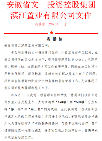 安徽二建文一·塘溪津門五標(biāo)項(xiàng)目管理團(tuán)隊(duì)堅(jiān)持疫情防控與復(fù)工復(fù)產(chǎn)兩手抓、兩手硬,管理團(tuán)隊(duì)齊心協(xié)力、盡職盡責(zé)、積極主動(dòng),保質(zhì)保量完成施工任務(wù)。在5月16日安徽省文一投資控股集團(tuán)濱江置業(yè)有限公司工程管理部組織的五月份質(zhì)量安全大檢查中,“47#樓”取得第一名的好成績(jī),獲建設(shè)單位通報(bào)表揚(yáng)。