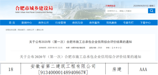 近日,在合肥市城鄉(xiāng)建設(shè)局網(wǎng)站關(guān)于公布2020年(第一次)合肥市施工總承包企業(yè)信用綜合評價(jià)結(jié)果的通知中,安徽二建公司在房建專業(yè)信用綜合評價(jià)獲得AAA級(jí)信用企業(yè),在454家參評企業(yè)中總排名第18名,市政專業(yè)信用綜合評價(jià)獲得AA級(jí)信用企業(yè),在331家參評企業(yè)中總排名第27名。此次合肥市施工總承包企業(yè)信用綜合評價(jià)準(zhǔn)備工作,由公司市場管理部牽頭,相關(guān)部門及所屬各單位配合,歷時(shí)一年時(shí)間。房建專業(yè)AAA級(jí)信用企業(yè)的獲得,有助于公司在合肥市場的公開招投標(biāo)。