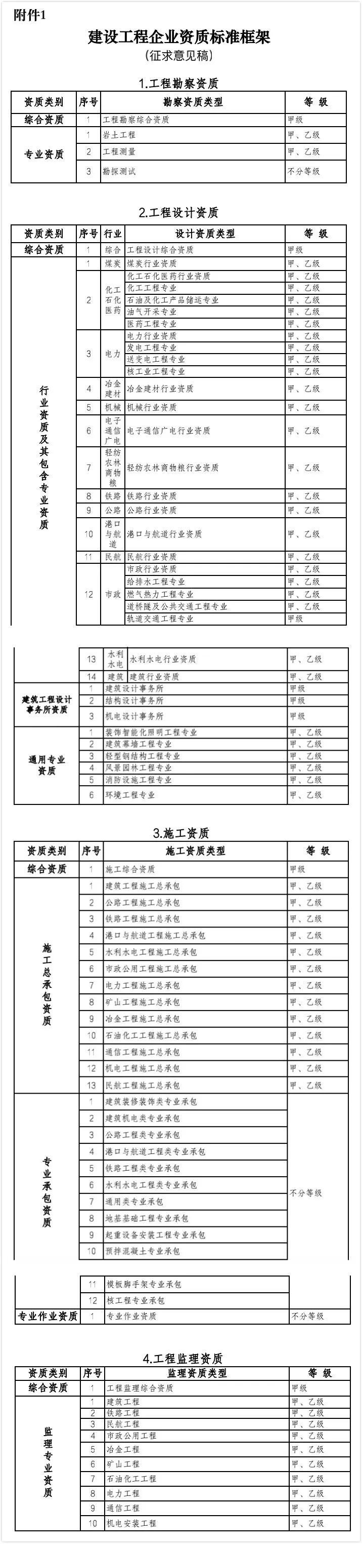 《建設(shè)工程企業(yè)資質(zhì)標(biāo)準(zhǔn)框架(征求意見稿)》全文如下: