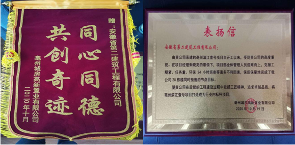 北京城房亳州公司真摯邀請(qǐng)四分公司及項(xiàng)目機(jī)關(guān)人員參加濱江壹號(hào)項(xiàng)目預(yù)售表彰會(huì),北京城房對(duì)二建公司的努力與付出表示肯定與認(rèn)可,并頒發(fā)錦旗與表?yè)P(yáng)信。