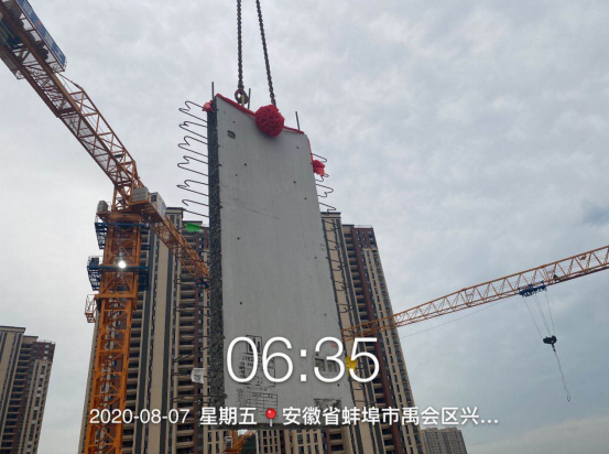 2020年8月7日,首批預(yù)制裝配式豎向構(gòu)件順利到達蚌埠山香安置房項目現(xiàn)場。項目管理人員對吊裝前準(zhǔn)備工作進行排查,確認無誤,隨著“起吊”一聲令下,塔吊緩緩將首塊墻板提升,整個起吊和安裝過程便捷順利,且安裝后平整度、垂直度均達到預(yù)期效果。項目技術(shù)人員對吊裝全過程及時記錄,為公司后續(xù)裝配式建筑的建造提供了第一手詳細數(shù)據(jù)。