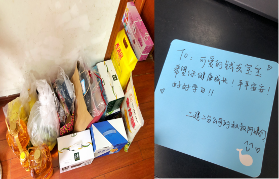 時隔三年,二分公司工會心系祖孫二人的生活狀況,了解到目前他們已被我公司職工接來合肥,老人租房帶著孫子在省二建幼兒園上學(xué)。志愿服務(wù)隊了解到具體需求后,即刻在分公司范圍內(nèi)組織了捐款和捐贈物資的扶貧幫困志愿服務(wù)活動,二分公司職工積極響應(yīng),踴躍捐贈,短短幾天時間募得慰問金4100元以及米面糧油、牛奶酸奶、水果、兒童圖書、玩具、老人及孩子的衣物鞋子等生活物品。2020年5月29日上午,二分公司工會主席黃業(yè)云帶領(lǐng)三支志愿服務(wù)隊代表前往老人家里看望老人及孩子。服務(wù)隊將大家捐獻(xiàn)的慰問金和生活物品一并交給了他們,希望能讓他們的生活過得好一點,能夠感受到二建大家庭的溫暖。交談中,老人質(zhì)樸的臉頰上始終帶著微笑,身旁的孫子也是乖巧懂事,非常有禮貌,一直開心地說著“謝謝叔叔阿姨!”