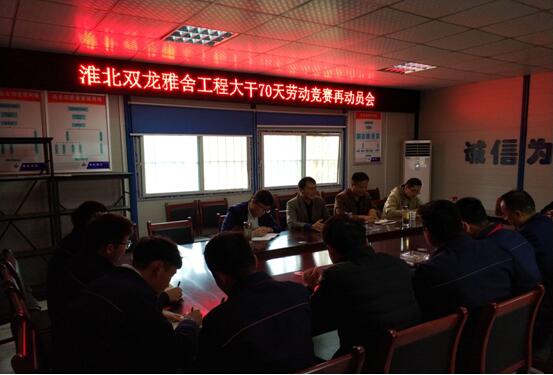 自十月初公司開展“大干70天”勞動競賽活動以來,淮北雙龍雅舍項目在項目經(jīng)理盧因東的帶領(lǐng)下積極響應(yīng)公司號召,合理安排工作計劃,精心組織施工部署,全面掀起大干熱潮。會上,崔書斌經(jīng)理要求項目部繼續(xù)保持高昂的工作熱情,倒排施工計劃,抓住關(guān)鍵節(jié)點。蒯家江宣貫了公司勞動競賽活動精神,指示項目部落實 “比、學(xué)、趕、幫、超”活動方式,提高認(rèn)識,端正態(tài)度。強調(diào)年輕管理人員要加強自身學(xué)習(xí),提高工作執(zhí)行力,養(yǎng)成良好的工作習(xí)慣;同時也要有面對挫折的勇氣,做到干一行愛一行,同心協(xié)力為二建的發(fā)展貢獻(xiàn)一份力量。