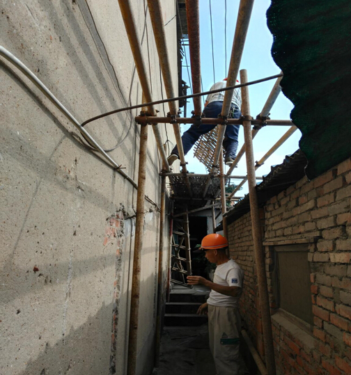 近日,公司后勤綜合服務(wù)部在對公司老舊房屋進行日常巡查時發(fā)現(xiàn),原四分公司生活基地大禮堂山墻檐口出現(xiàn)間斷式沉降斷裂。經(jīng)檢查,此處的問題是由墻體自重及屋面木質(zhì)結(jié)構(gòu)自然腐朽所導(dǎo)致的。山墻腳即是住戶出入通道,隨時有墜落傷人的安全隱患。鑒于大禮堂層高十幾米,無法實施維修處理,我部第一時間向領(lǐng)導(dǎo)匯報后,及時拿出整頓方案,頂著烈日高溫,立即沿山墻搭建一條十幾米長的鋼管架安全通道,排除了隱患,確保居民出入平安。