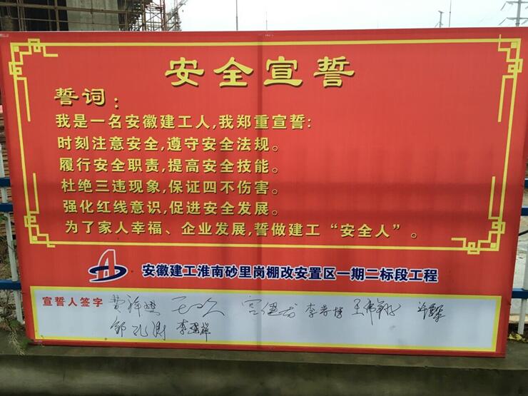 早上六點,清晨第一縷陽光剛剛灑下,項目部管理人員已在安全宣誓牌前排列整齊,面對莊嚴的宣誓牌,全體成員在項目技術負責人王歡的帶領下,右手握拳置于面龐,鄭重地齊聲宣讀誓詞:我是一名安徽建工人,我鄭重宣誓:時刻注意安全,遵守安全法規(guī);履行安全職責,提高安全技能;杜絕三違現象,保證四不傷害;強化紅線意識,促進安全發(fā)展;為了家人幸福,企業(yè)發(fā)展,誓做建工“安全人”。隨后,項目部全體成員在項目經理費祥琪的帶領下,陸續(xù)在宣誓牌上簽下了自己的名字,表明自己時刻謹記安全宣誓內容,堅持安全生產的決心。